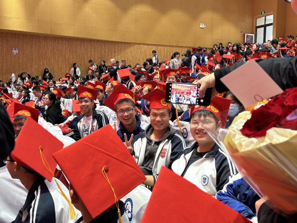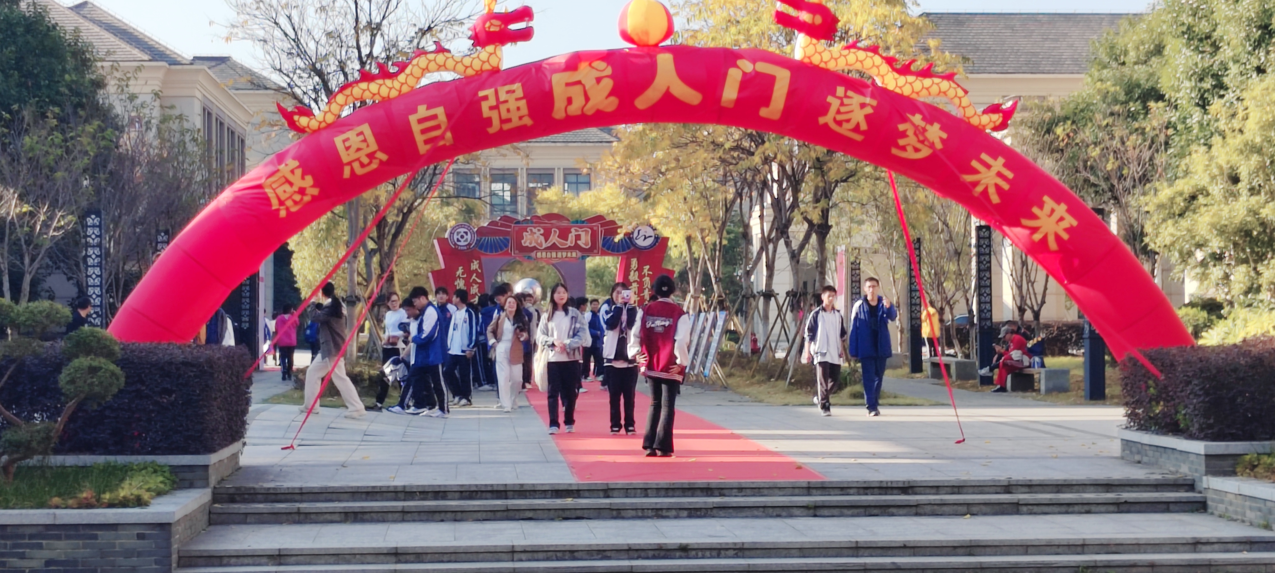 在歌声中,同学们在各班主任的带领下按秩序走出会场,踏上红地毯,走过成人门,言笑晏晏,留下青春最美的一刻,并在签名墙上签字留念、合影。以祝愿各位同学平安顺遂,未来可期。