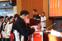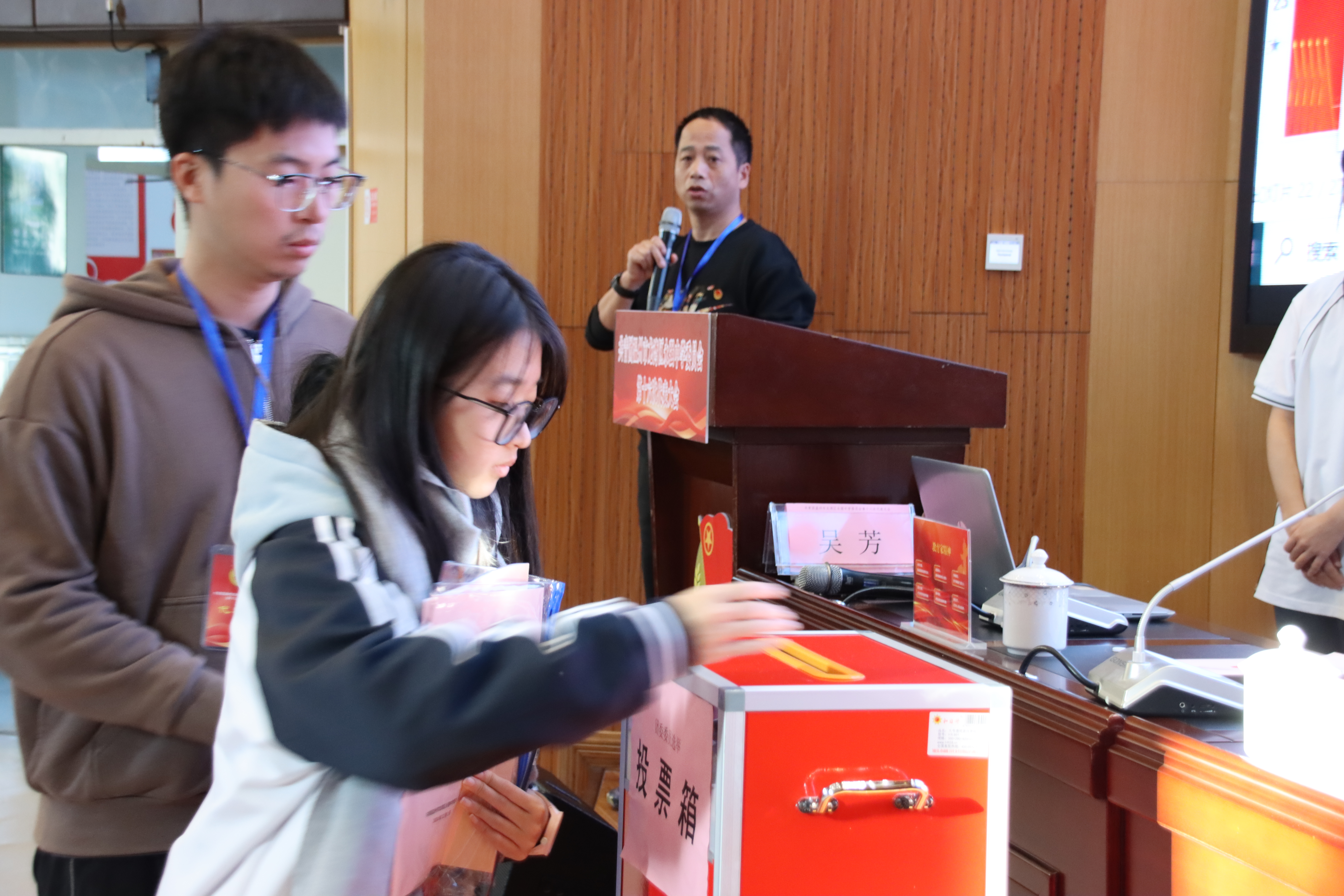 3点代表们准时落座会议室进入大会选举环节。投票工作即将进行。通过这次投票,第十六届团委委员即将诞生。总监票人贺辉老师带领所有监票人履行了所有选举议程,讲解了选举注意事项。在确定选举是公平公正公开之后,代表们填写了自己的选票,并且亲手把选票庄重的投进了票箱,接下来紧张的计票工作开始了。